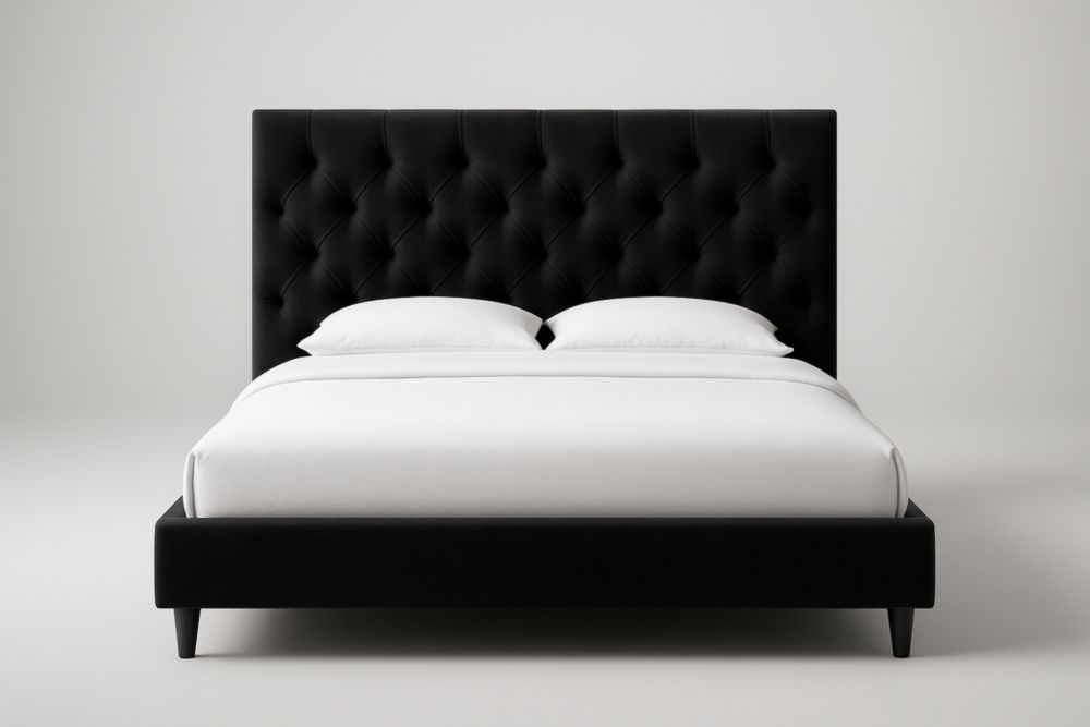 Structure interne en pin massif et MDF, revêtement en velours polyester, tête de lit rembourrée en mousse polyuréthane, pieds en acier peint, sommier à lattes en pin massif.